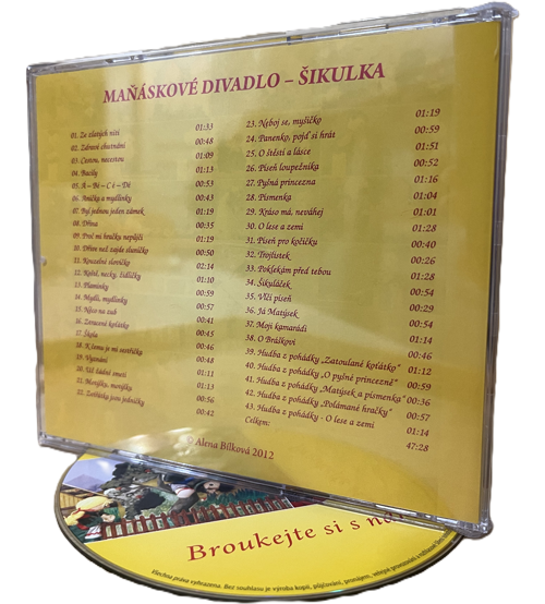 Na tomto nosiči si můžete poslechnout písně z našeho představení, nebo si popřípadně vytisknout písničky s notovým zápisem, které jsou na CD uloženy v souboru PDF.